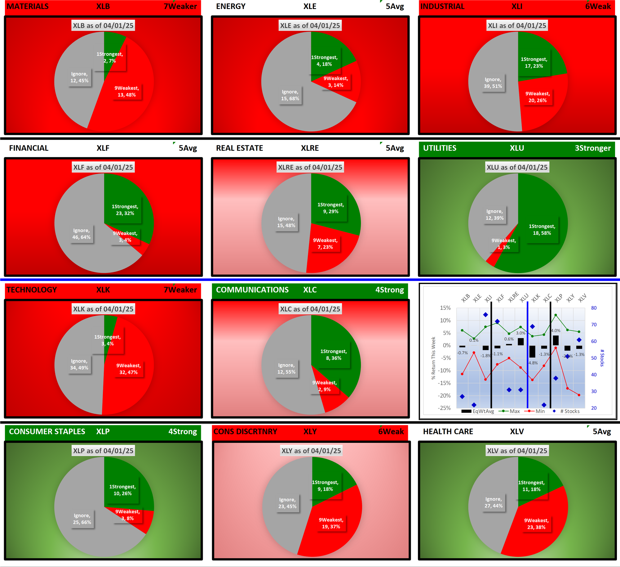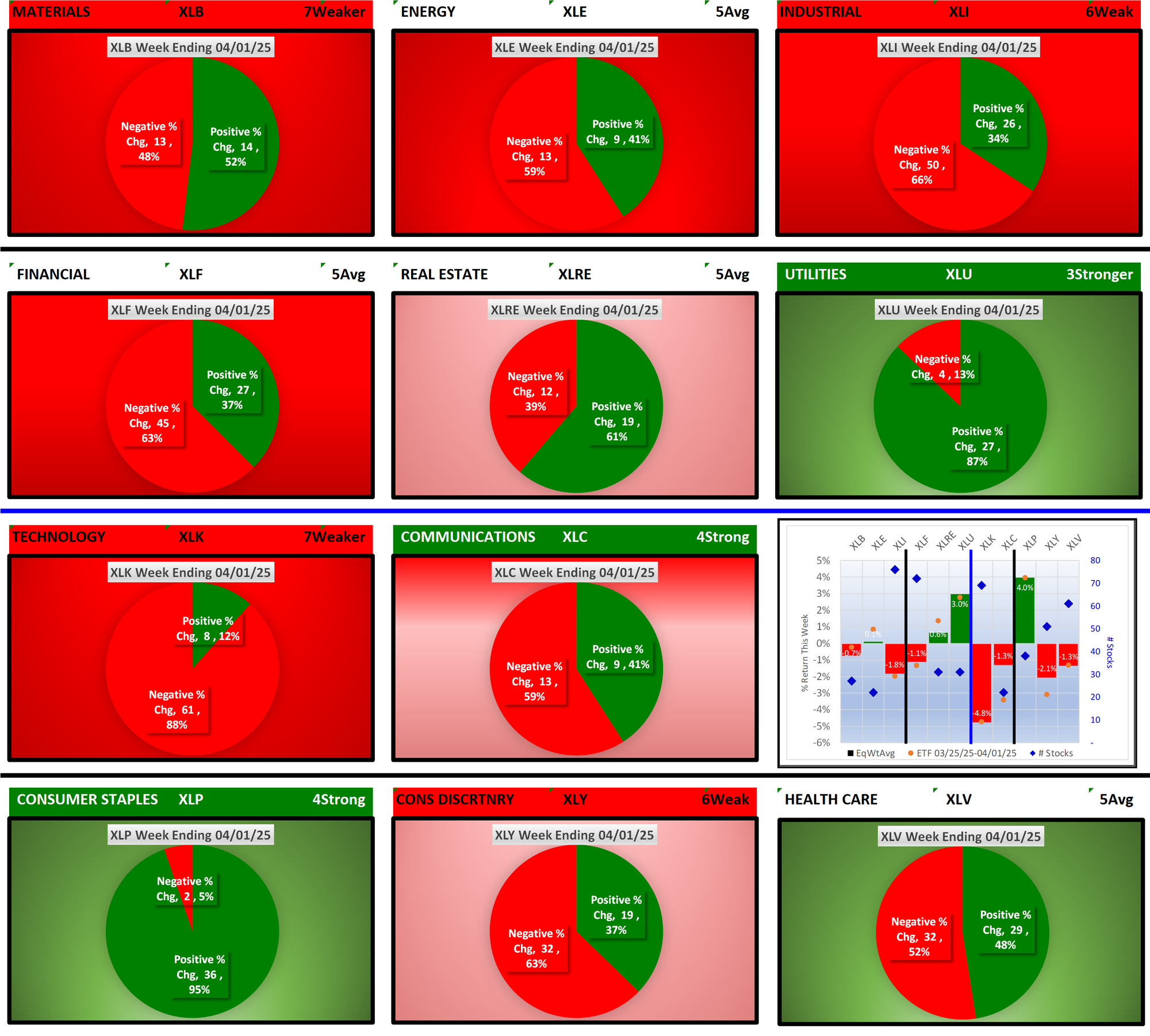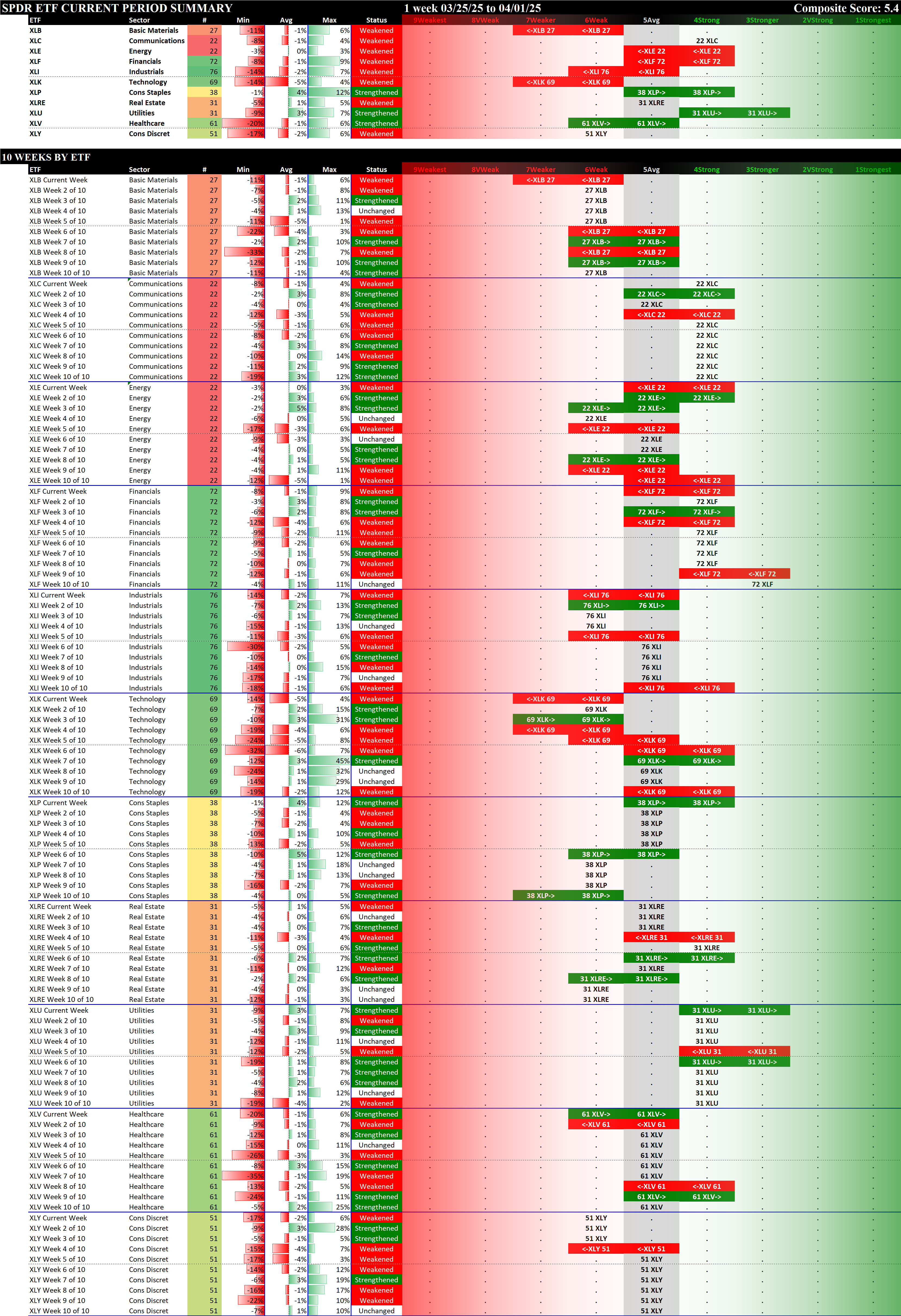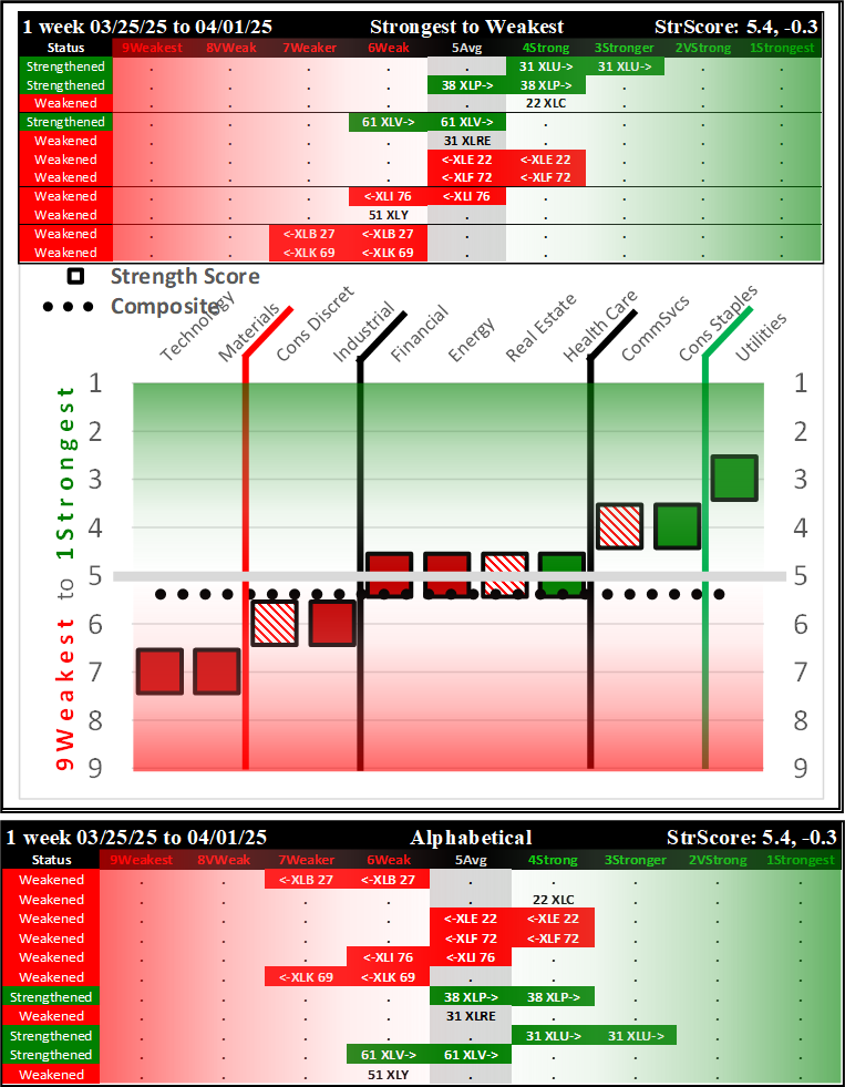 SPDR Sector ETFs Tue 2025-04-01: 5.4 Strength Score (Weakened -0.3)