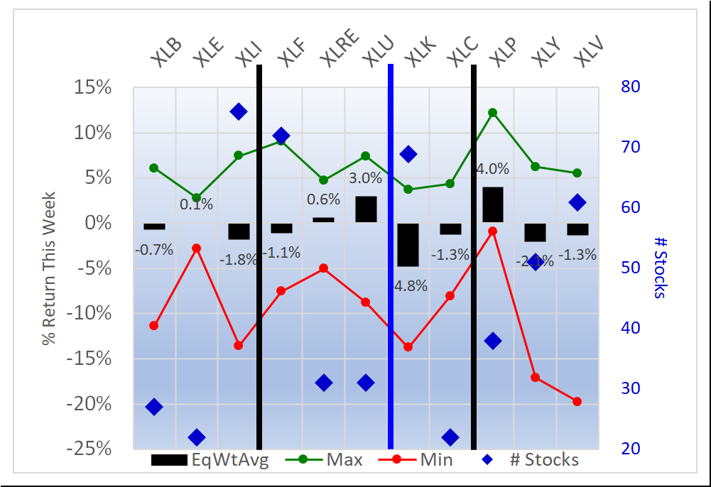- XLP/Consumer Staples, 4.0% average for 38 stocks