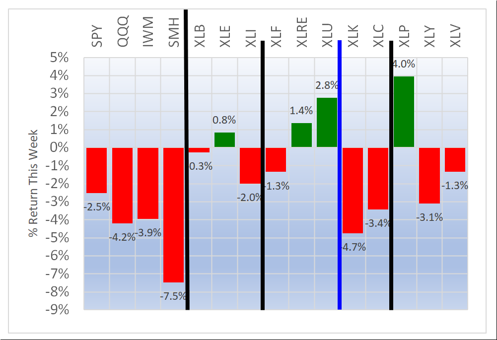 - Second row: interest rate-sensitive ETFs XLF/Financial, XLRE/Real Estate, and XLU/Utilities