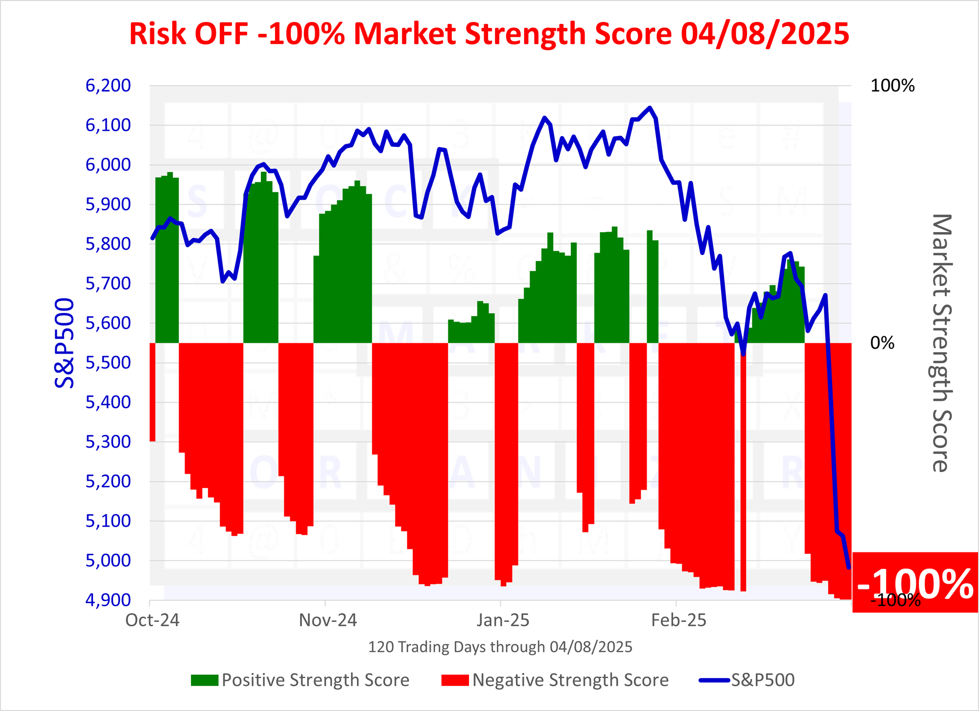 These results are combined with overall market environment readings - the Market Strength Score and the Sector Risk Gauge, which reflect "Risk OFF" as of Friday, March 28, 2025 - to discern appropriate portfolio exposure and risk/position management given prevailing market and sector conditions.