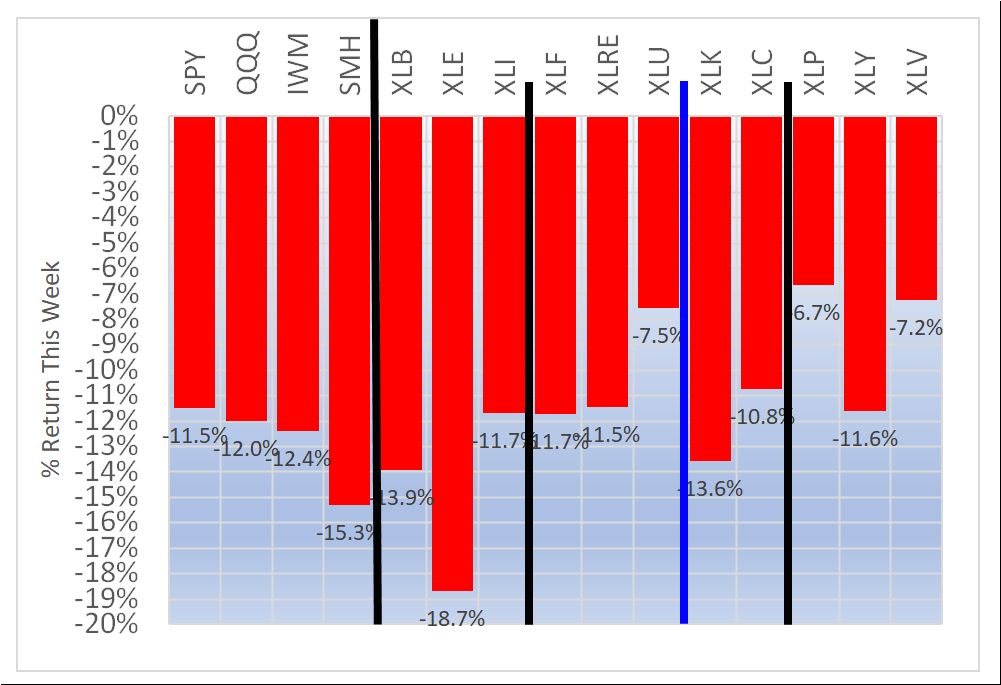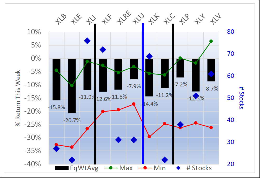 - XLP/Consumer Staples, -7.2% average for 38 stocks
