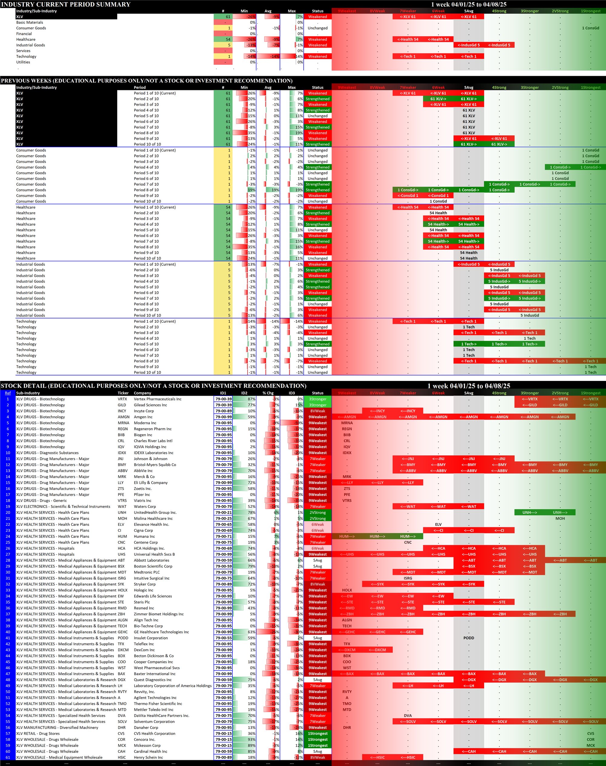 The downloadable PDF below lists all component stocks in order of first Strongest to Weakest ETF and second Strongest to Weakest Stock. The difference between this report and the 11 ETF stock listings above is this report consolidates all component stocks whereas the above listings are segregated by ETF.