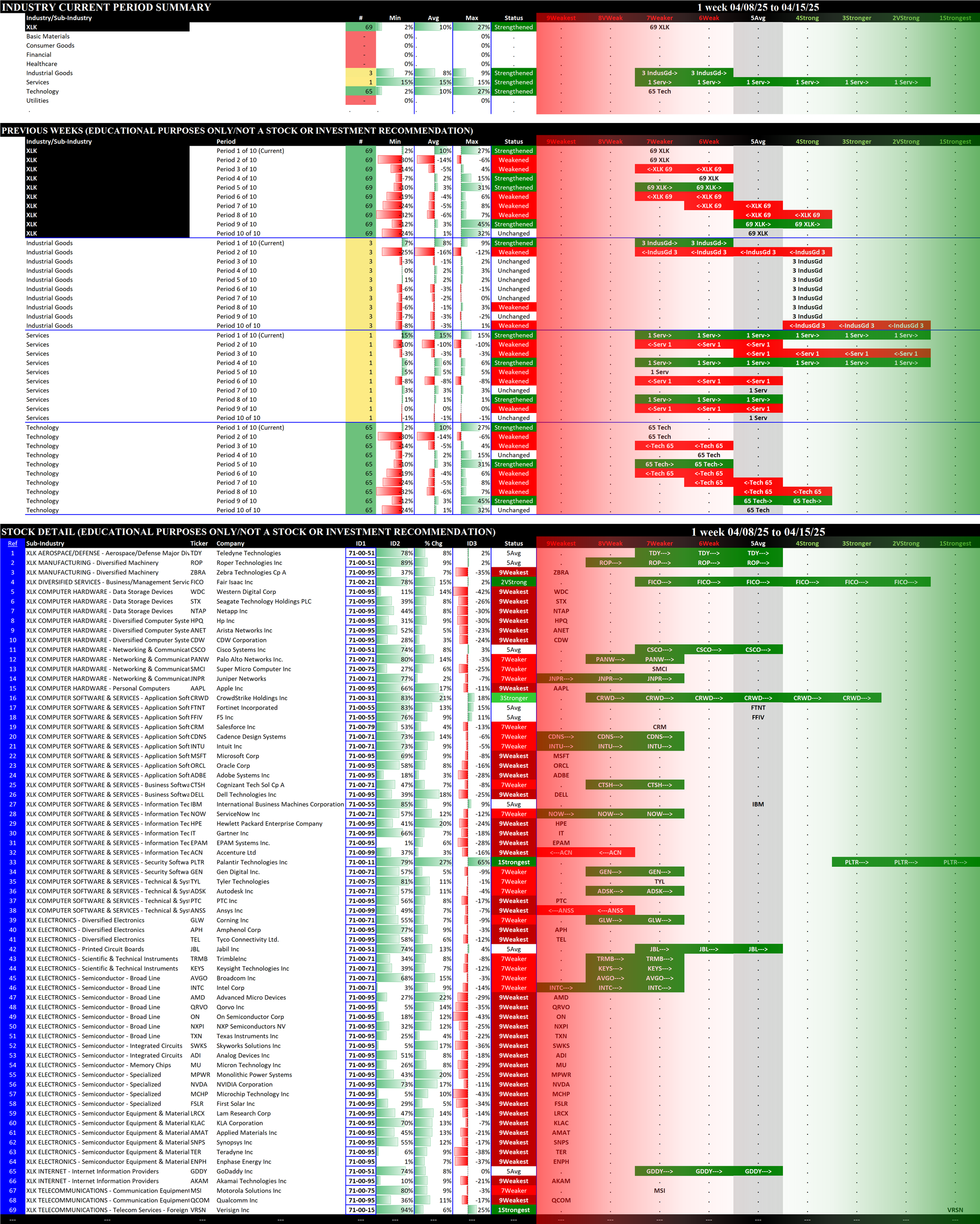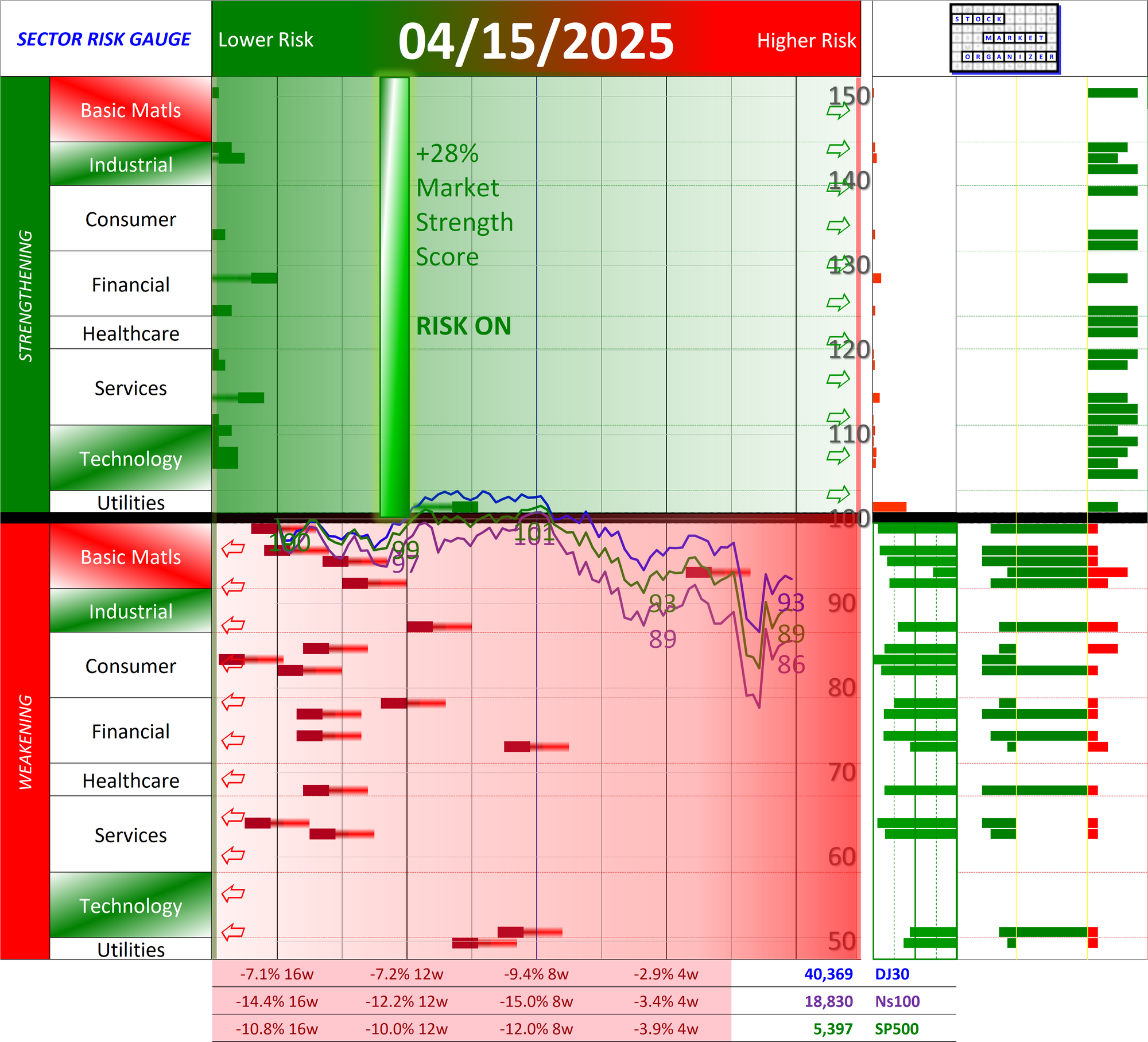 These results are combined with overall market environment readings - the Market Strength Score and the Sector Risk Gauge, which reflect "Risk ON" as of Thursday, April 10, 2025 - to discern appropriate portfolio exposure and risk/position management given prevailing market and sector conditions.