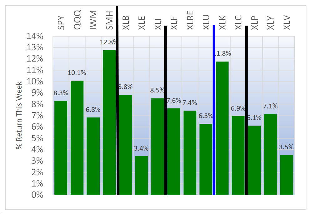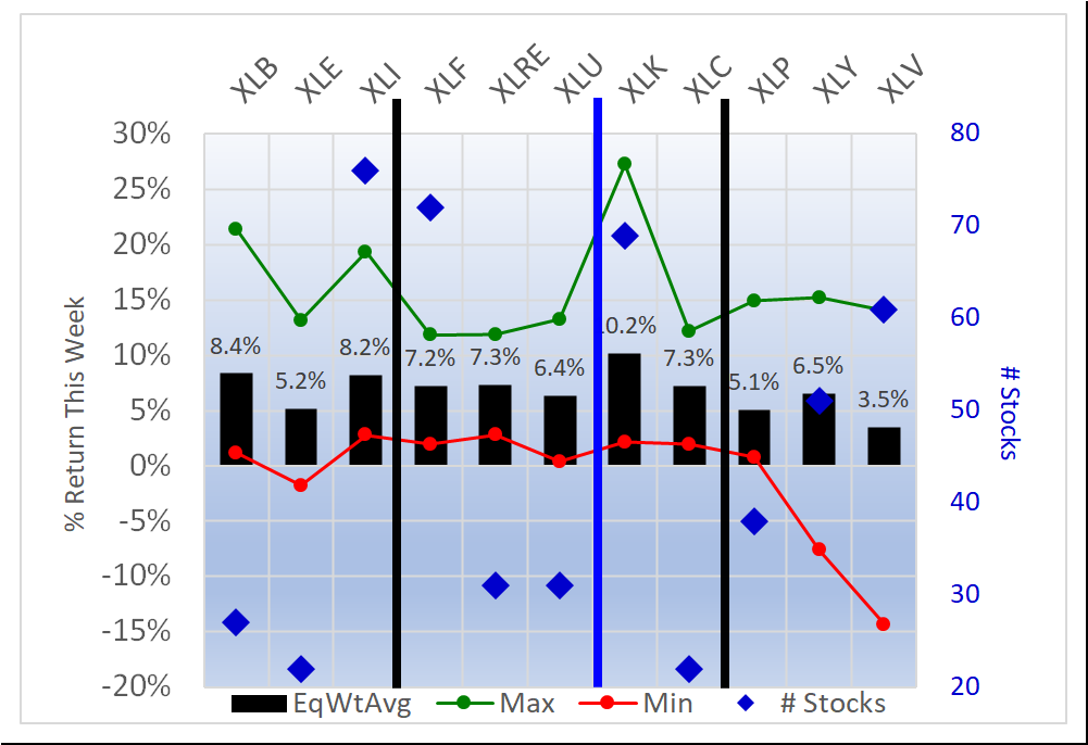 The average returns for the underlying stocks in each ETF are shown below - note this is NOT the return for the ETF for this week, which is shown below in Section IV. Today's Market Context.