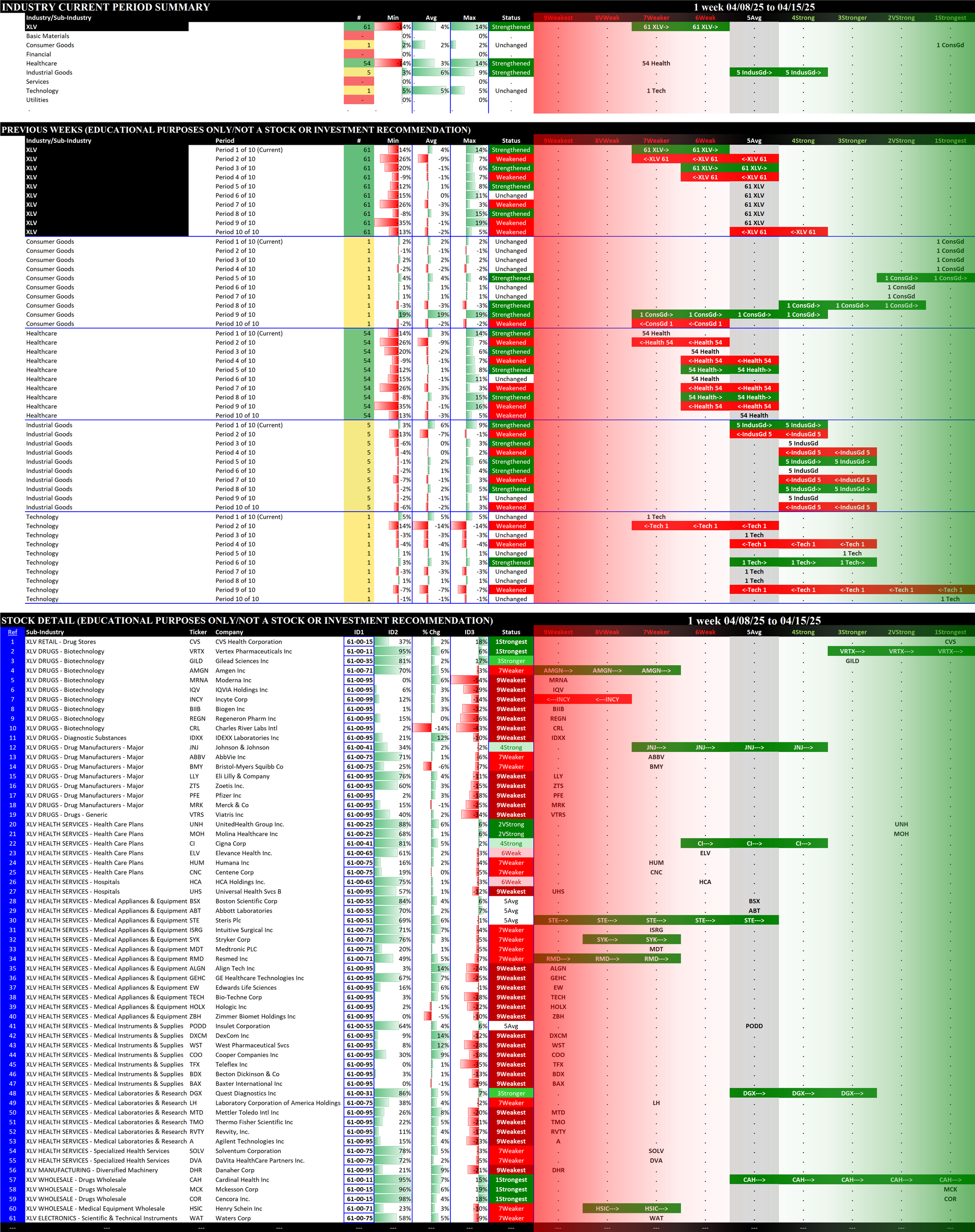 The downloadable PDF below lists all component stocks in order of first Strongest to Weakest ETF and second Strongest to Weakest Stock. The difference between this report and the 11 ETF stock listings above is this report consolidates all component stocks whereas the above listings are segregated by ETF.