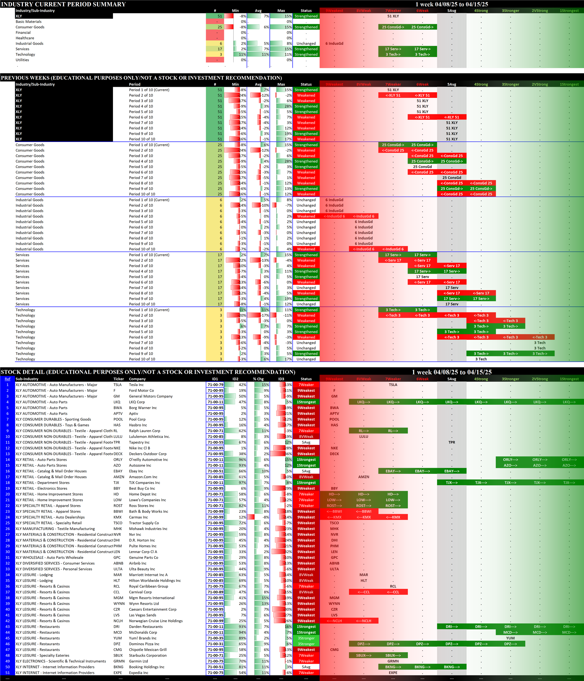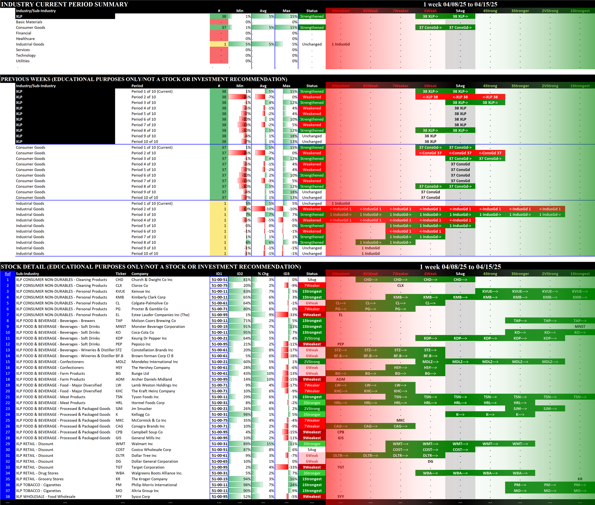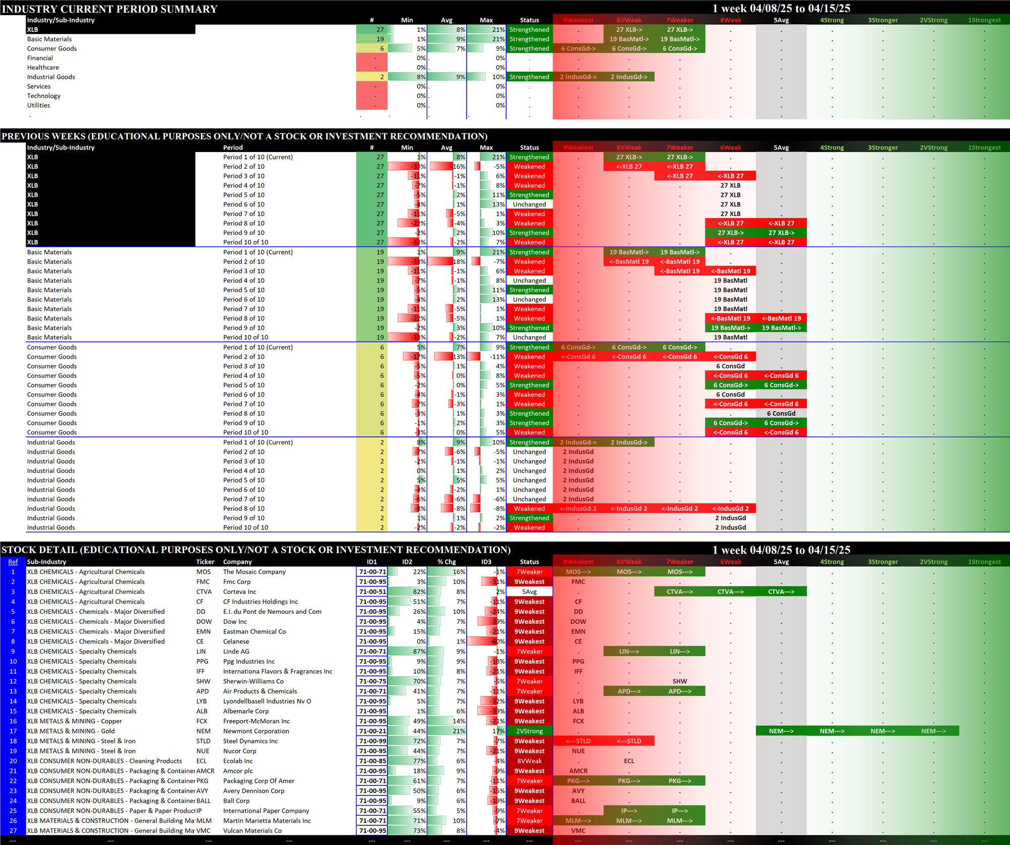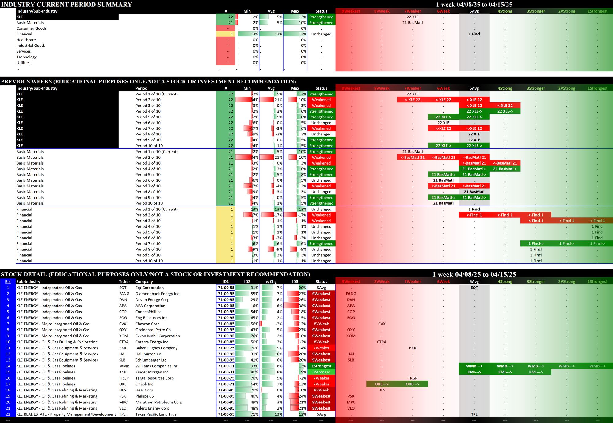 - The middle section shows the previous 10 weeks' strengthening and weakening of the relevant sectors. For example, since the XLB has Basic Materials, Consumer Goods, and Industrial Goods stocks, these three sectors are shown in the middle section of the XLB detail. The XLF (Financial) has Financial, Services, and Tech stocks.