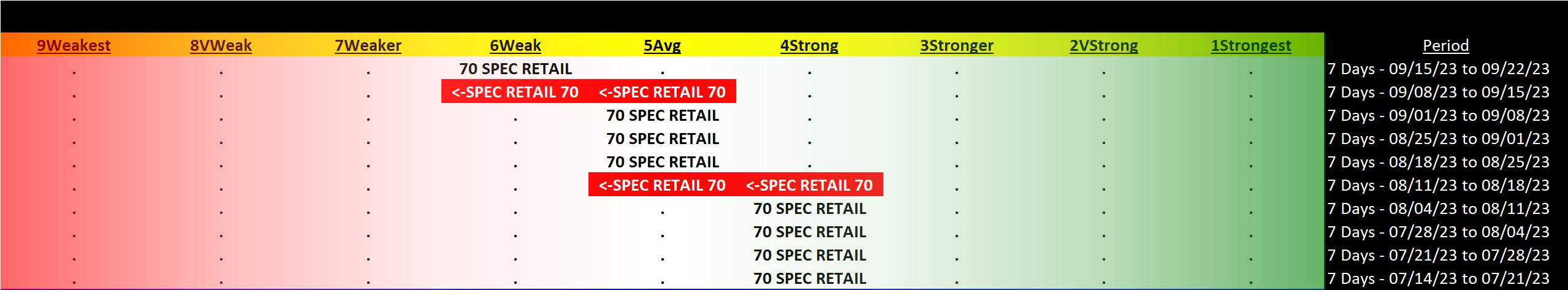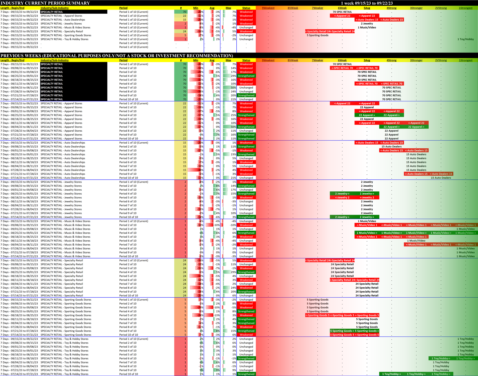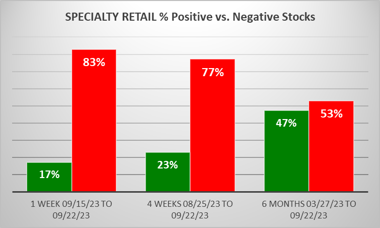 Specialty Retail 2023-09-22: Unchanged at WEAK strength rating (6th strongest of 9 levels), previous move was DOWN