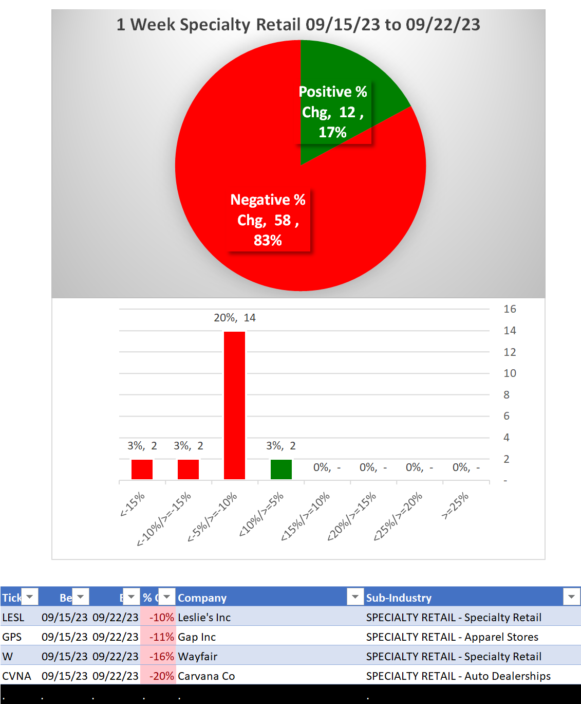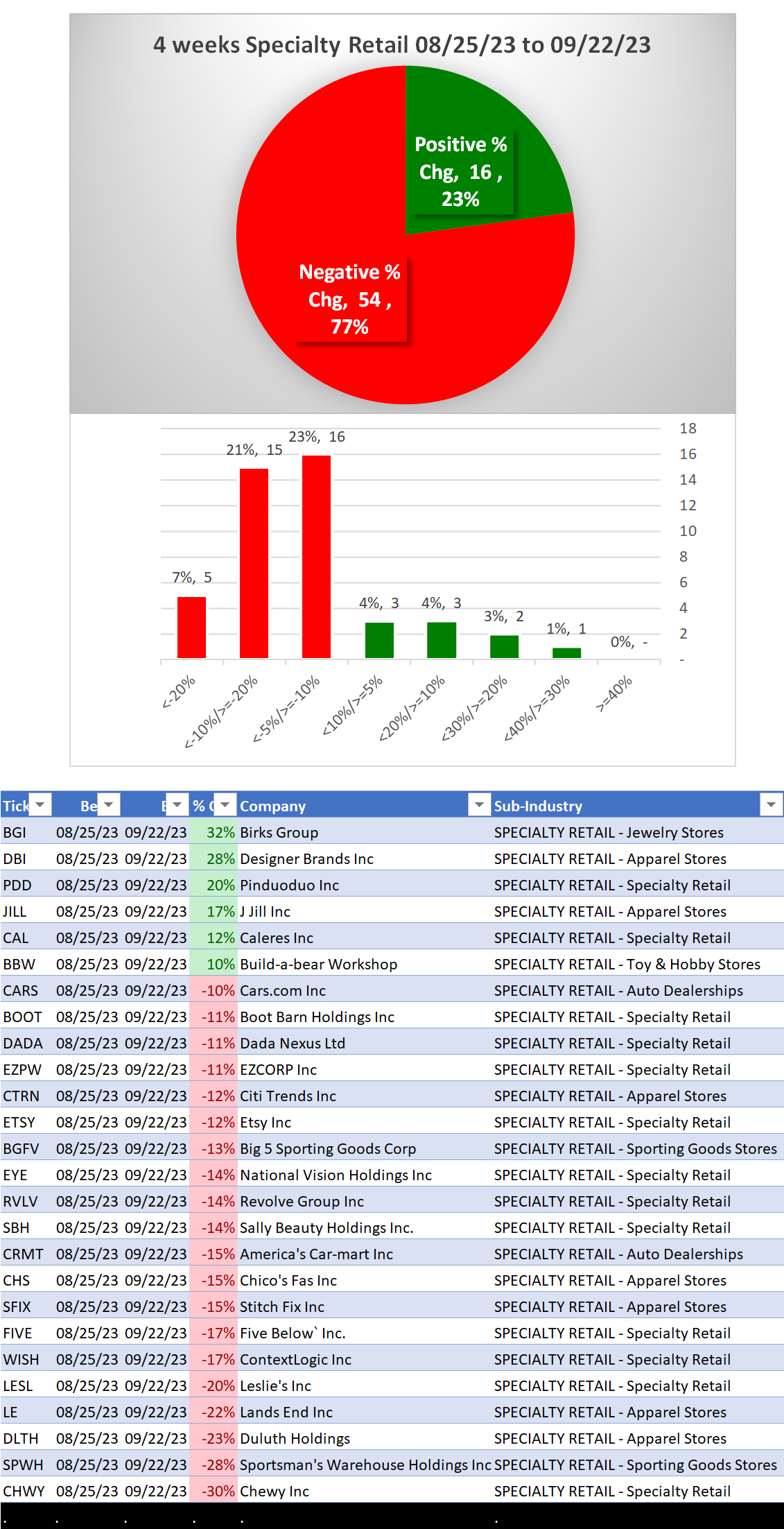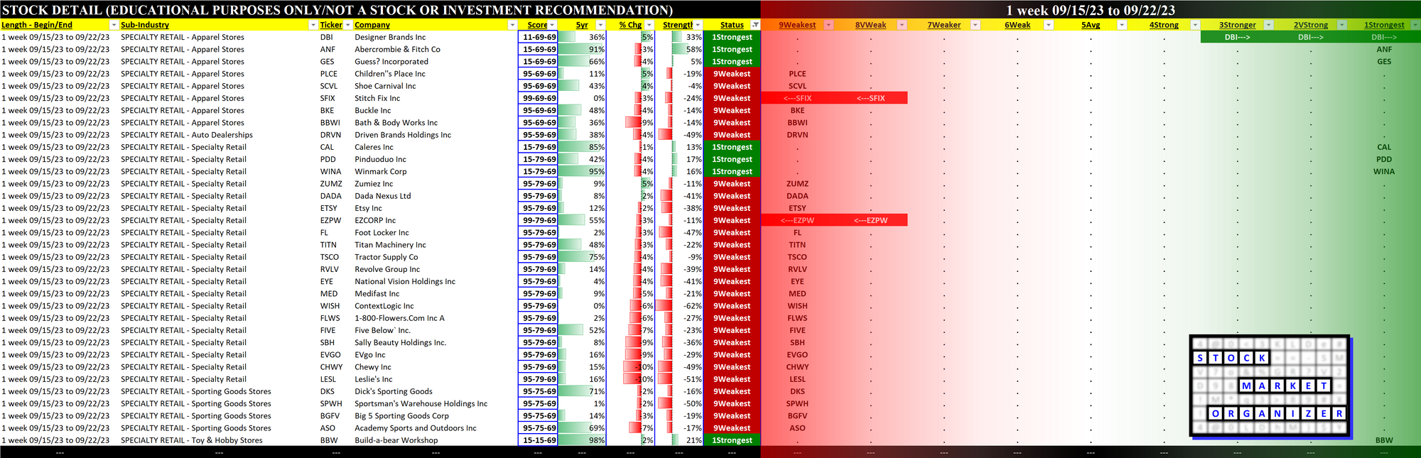 Specialty Retail 2023-09-22: Unchanged at WEAK strength rating (6th strongest of 9 levels), previous move was DOWN
