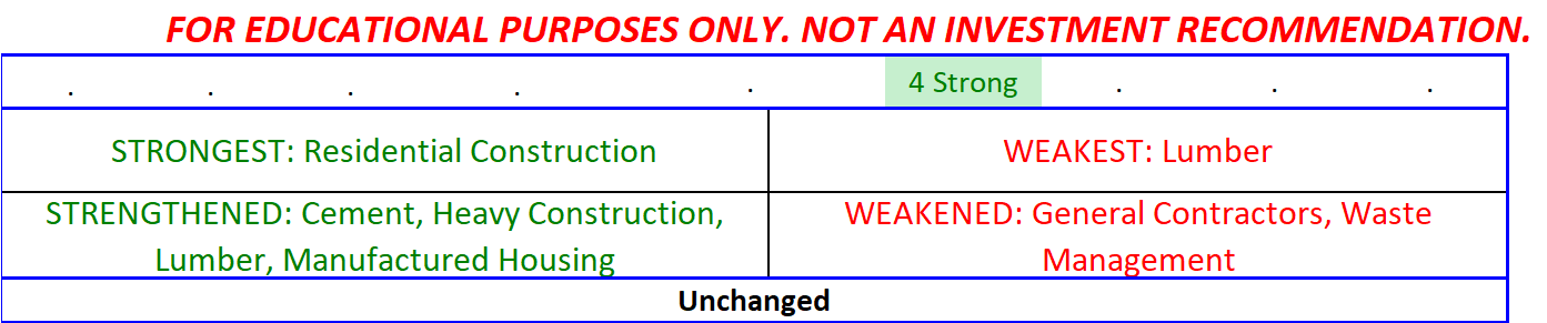 This method is helpful in that one can easily see the individual stocks that are leading and lagging in each industry/sub-industry. Previous posts have provided detailed stock-by-stock reports. If you are interested in seeing stocks compared within specific industries/sub-industries please contact me as noted here. These reports will be provided periodically for free subscribers.
