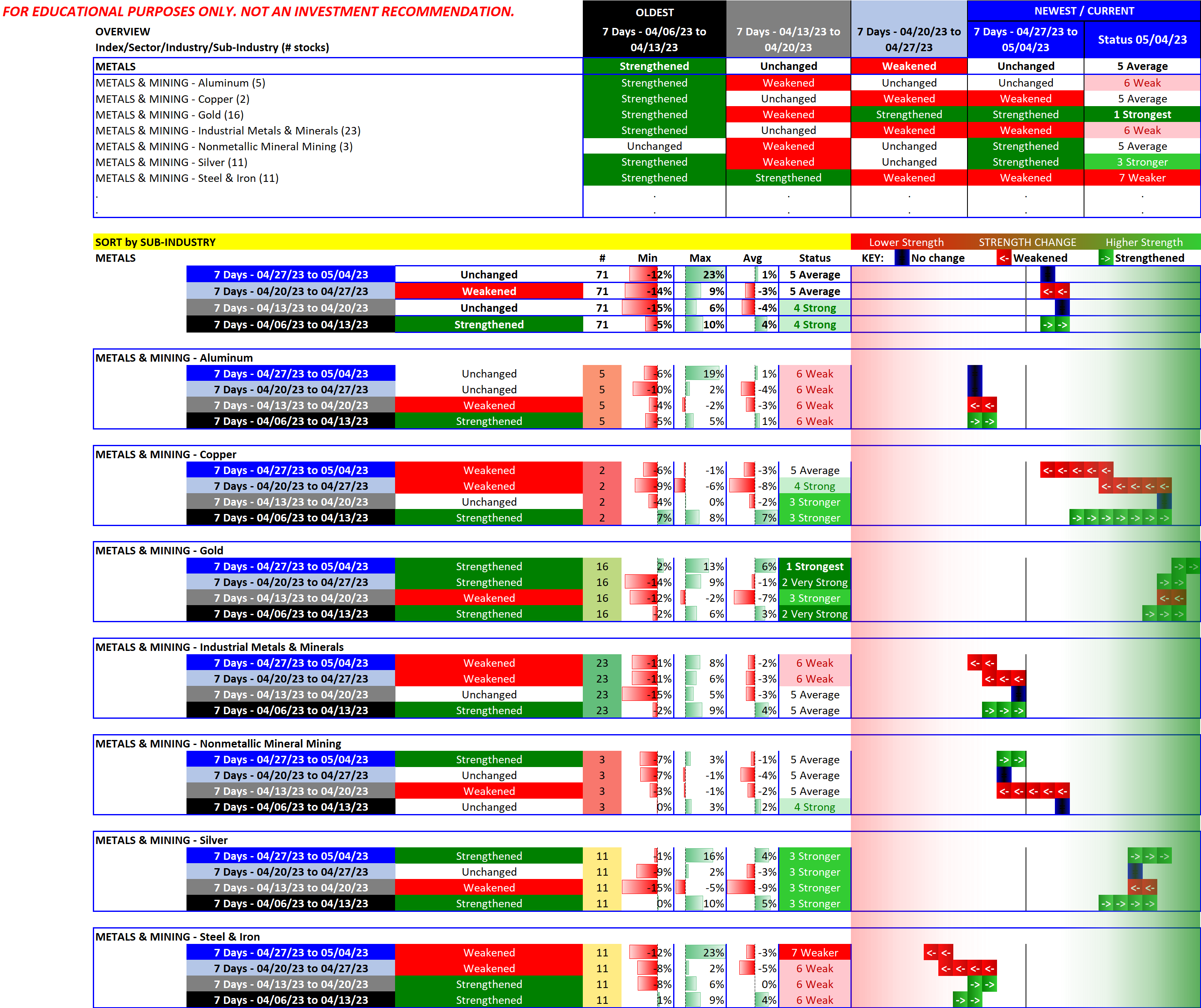 Energy, Materials/Construction, Metals/Mining strength status as of 2023-05-04?
