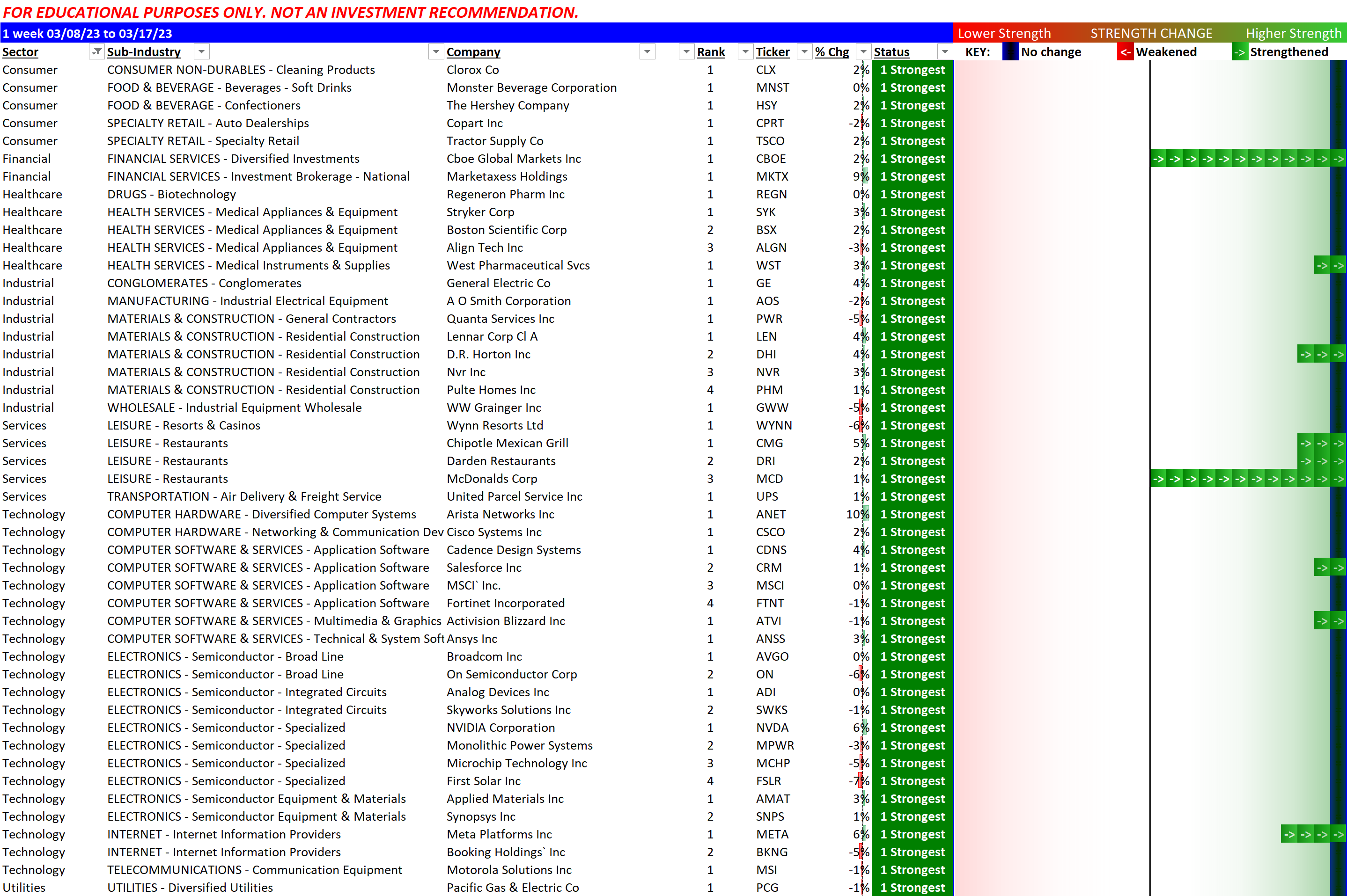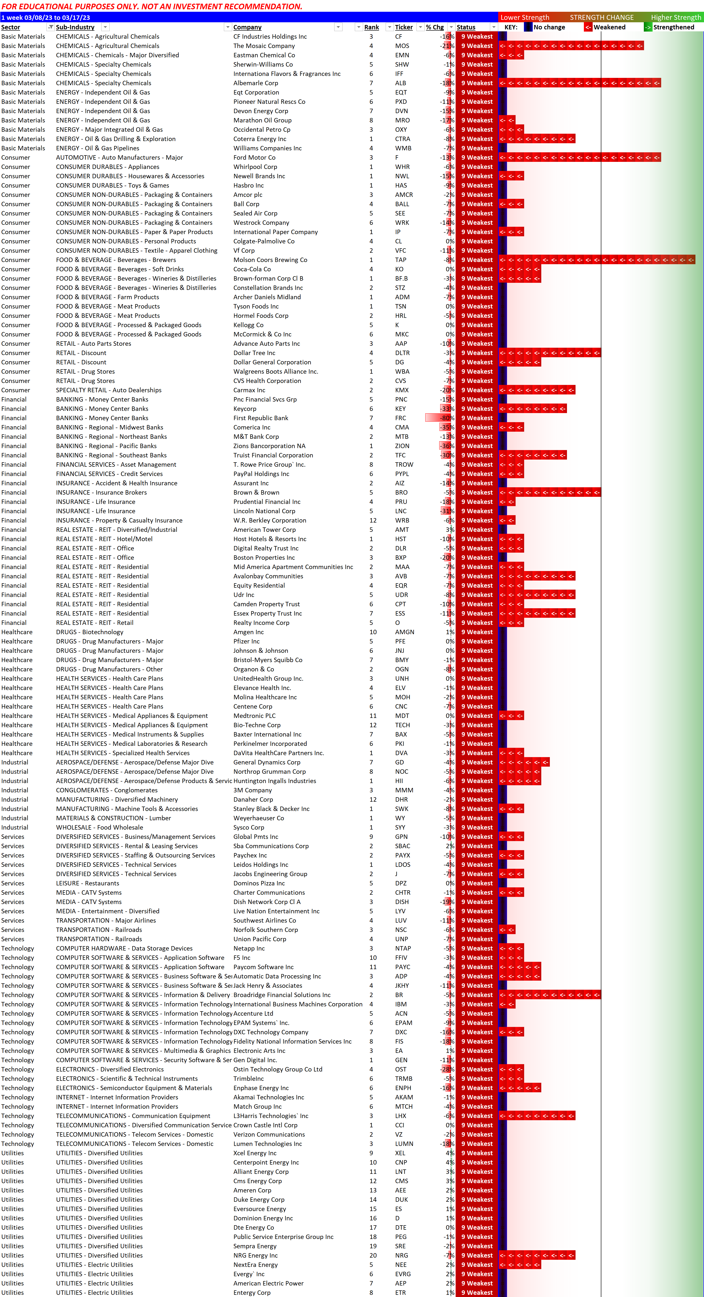 Here's a look specifically only at the strongest S&P500 stocks - these have held up since the banking chaos started. There is a good number of tech stocks here. Note in a generally weak Utilities industry that Pacific Gas & Electric/PCG is holding up.