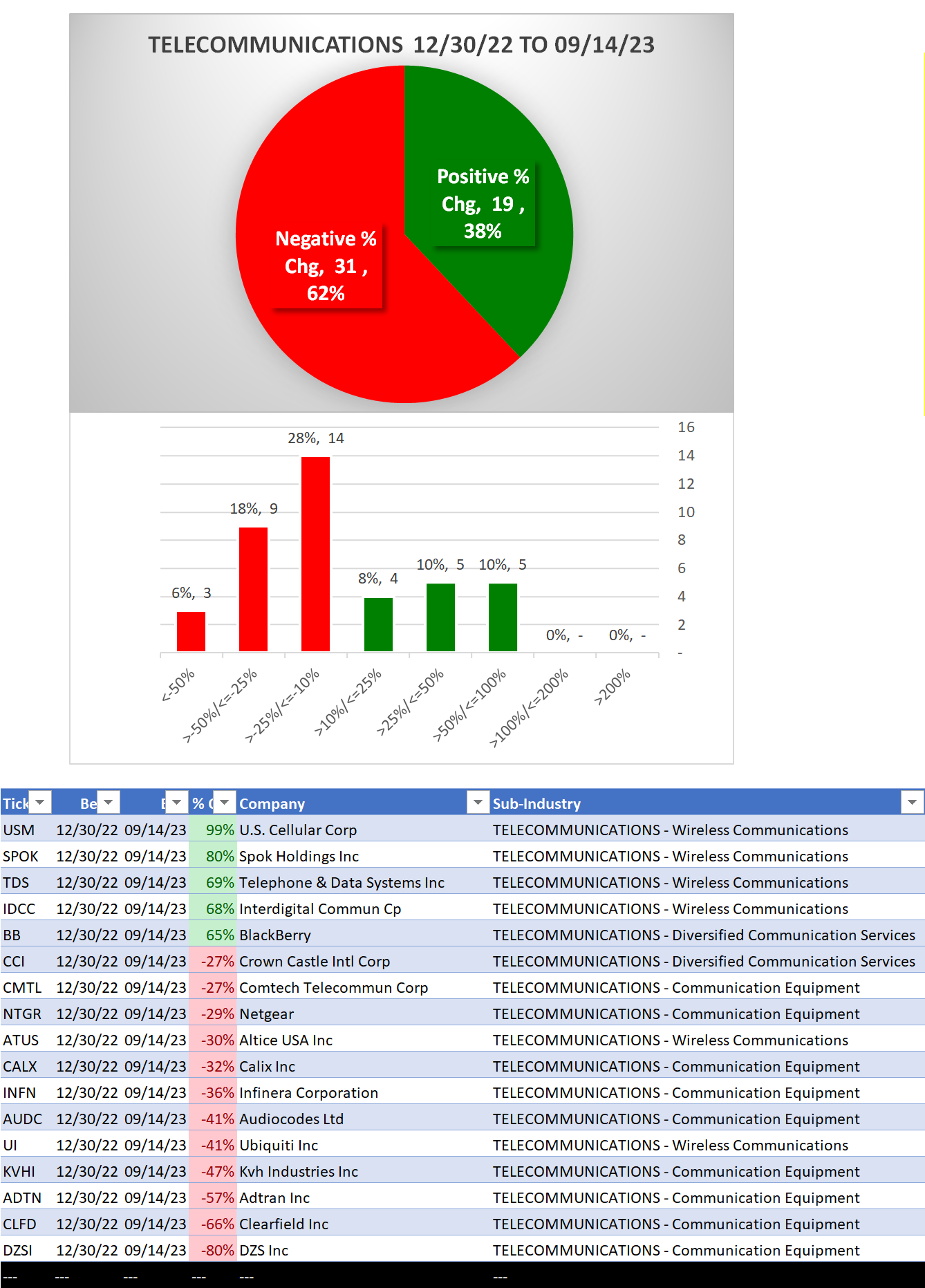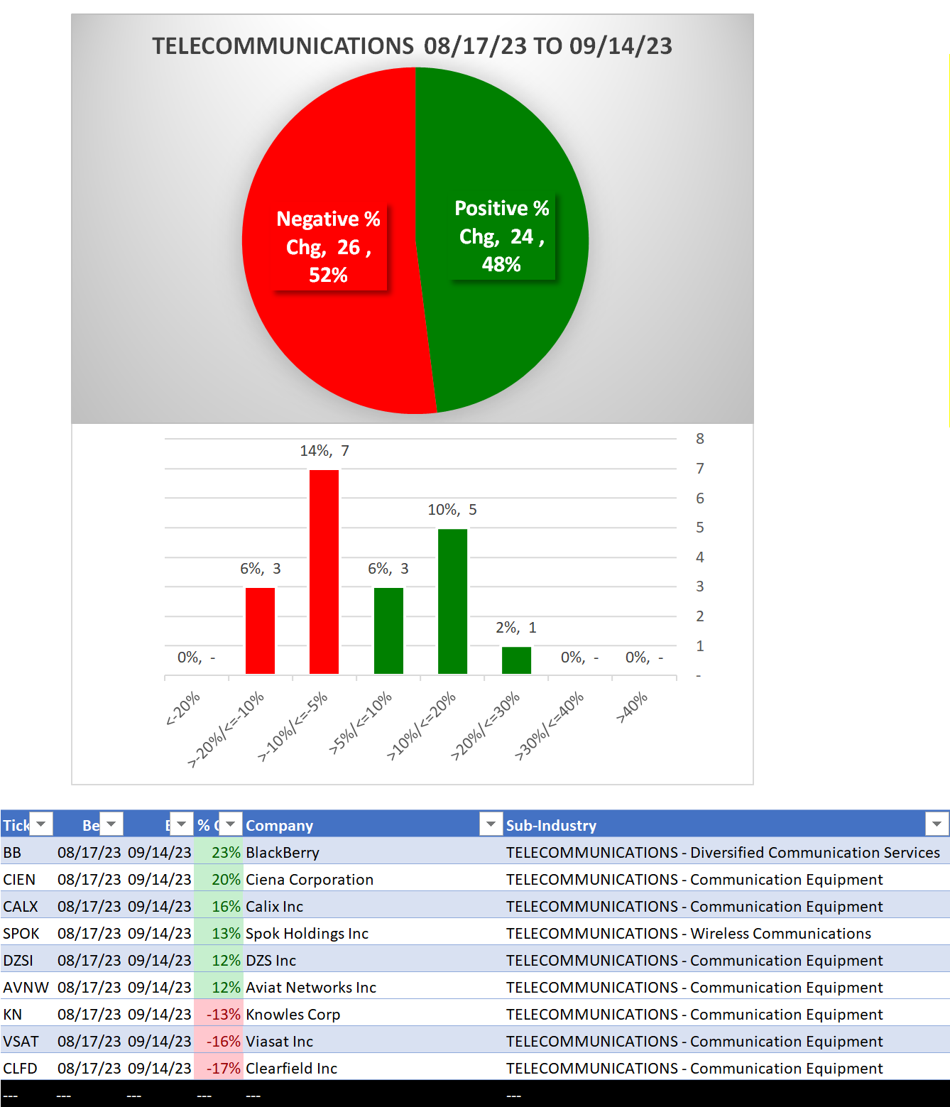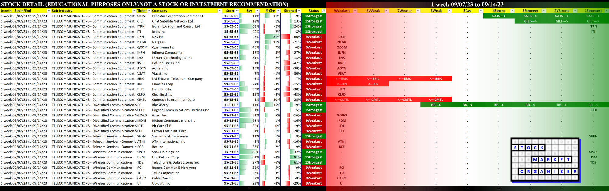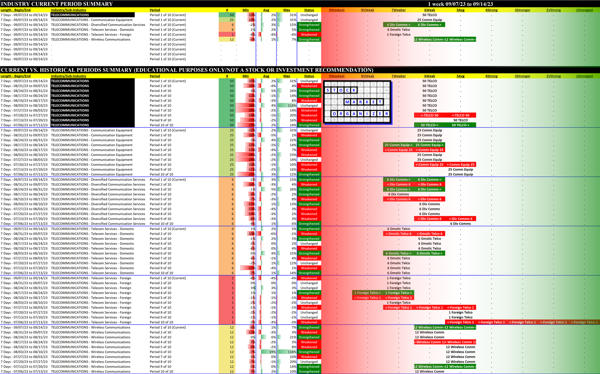 Telecommunications 2023-09-14: Unchanged at "WEAK" strength rating (6th strongest of 9 levels), previous move was DOWN