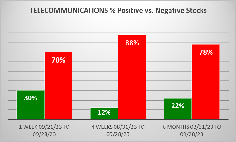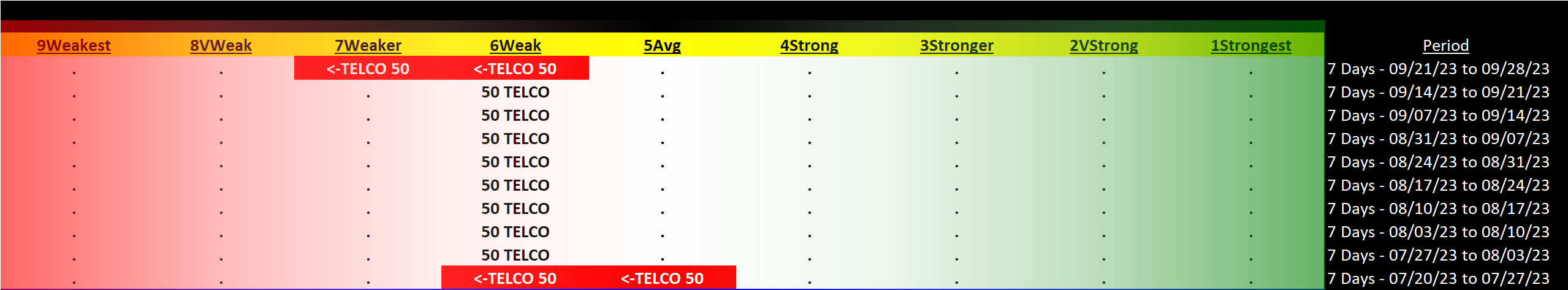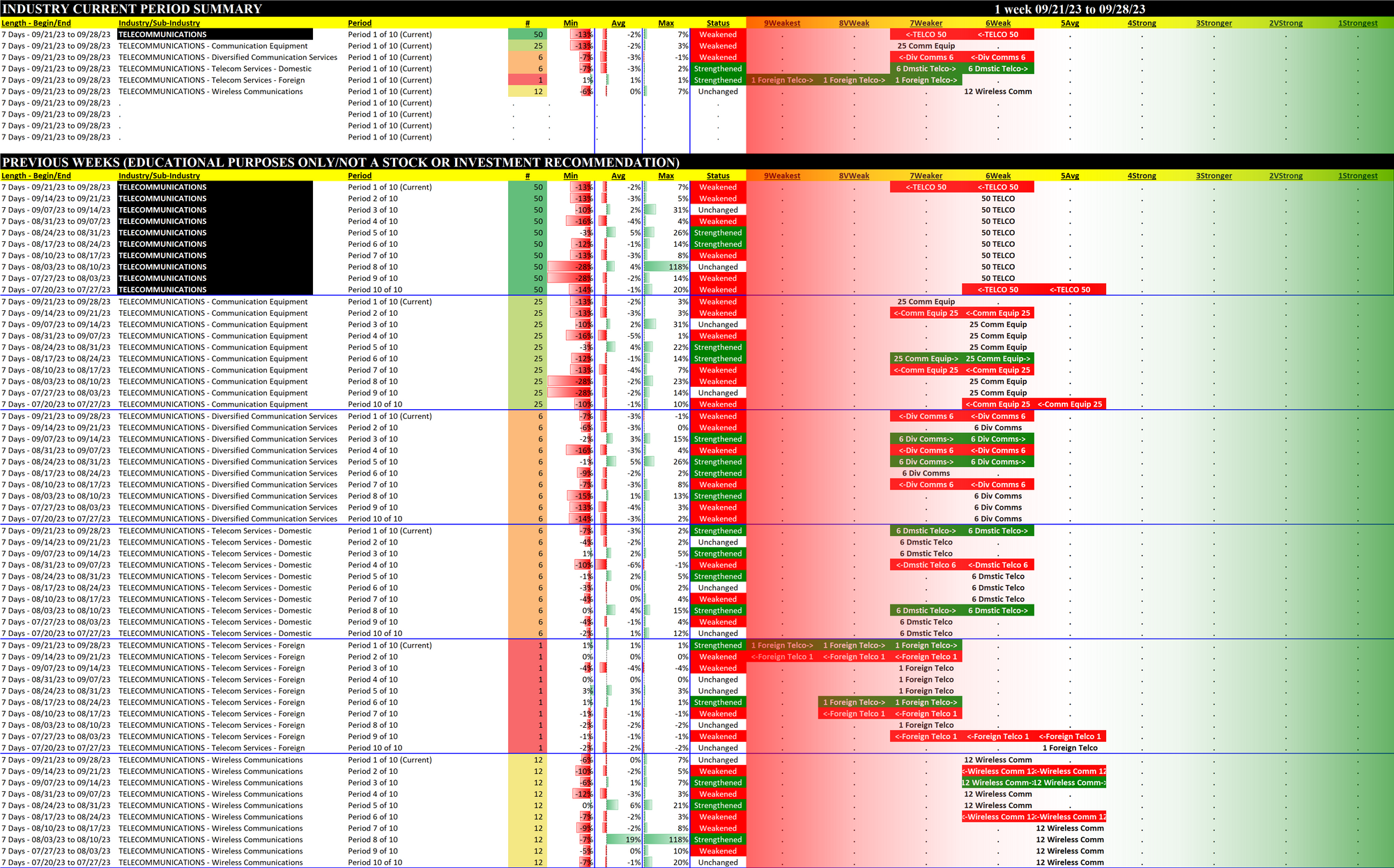 Telecommunications 2023-09-28: DOWN -1 to WEAKER strength rating (7th strongest of 9 levels), previous move was also DOWN