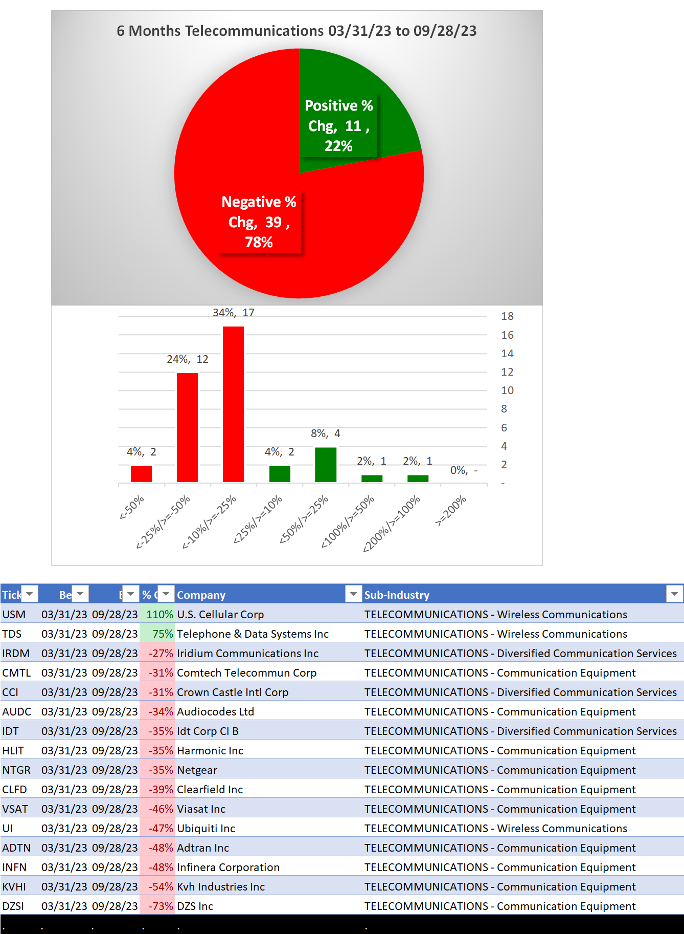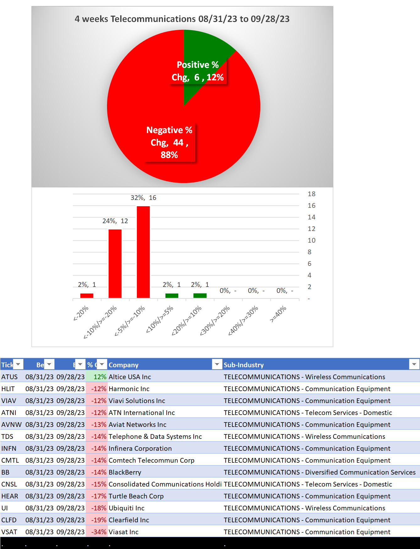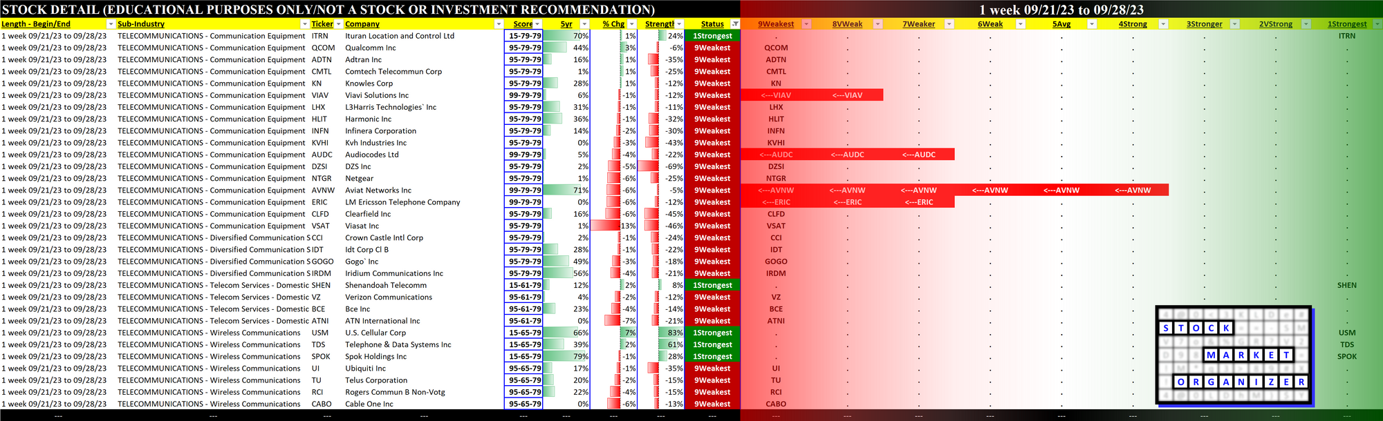 Telecommunications 2023-09-28: DOWN -1 to WEAKER strength rating (7th strongest of 9 levels), previous move was also DOWN