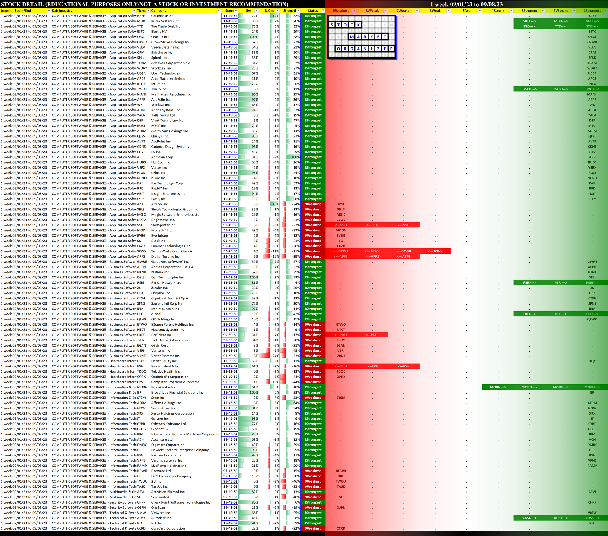 Current strongest and weakest stocks are shown below. These are of most interest as the downtrodden are prone to large (if perhaps temporary) pops while the strongest have been leading the charge for their sub-industries.
