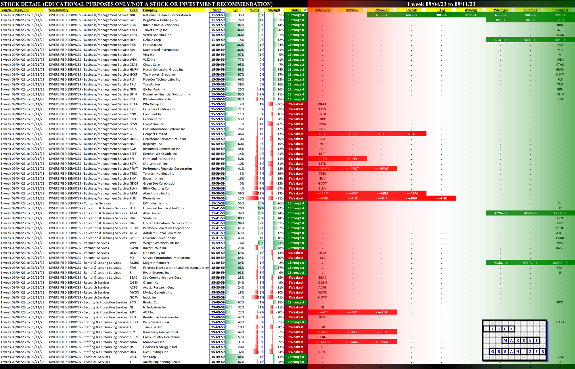 Current strongest and weakest stocks are shown below. These are of most interest as the downtrodden are prone to large (if perhaps temporary) pops while the strongest have been leading the charge for their sub-industries.