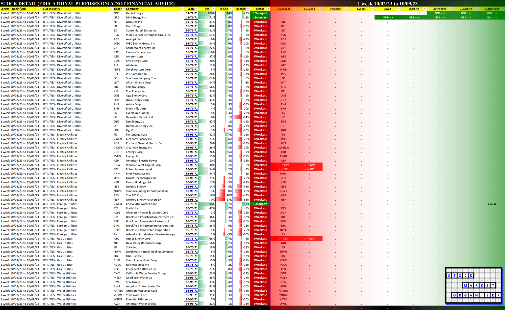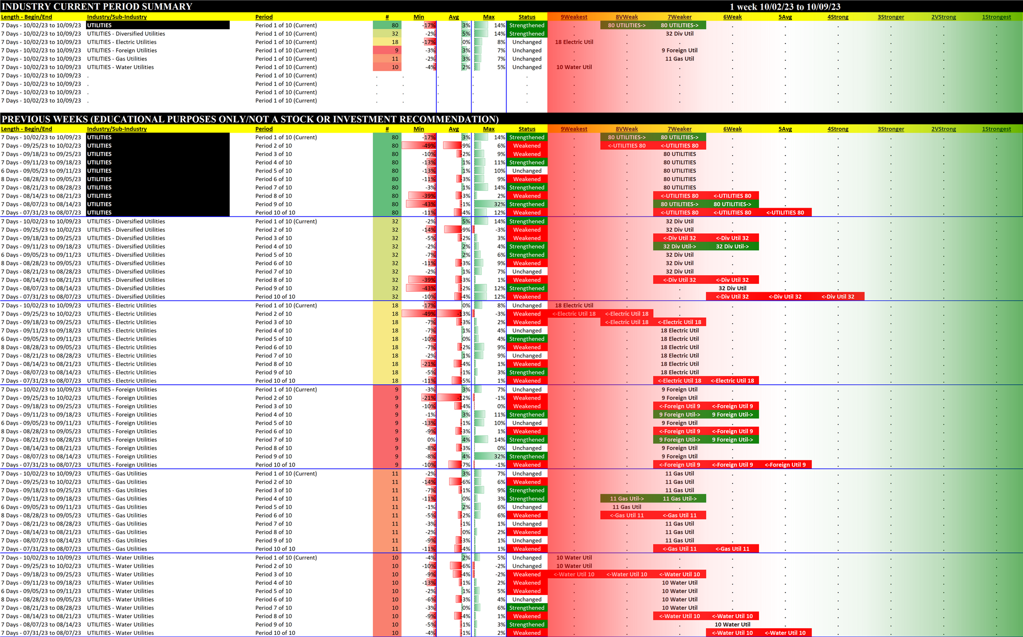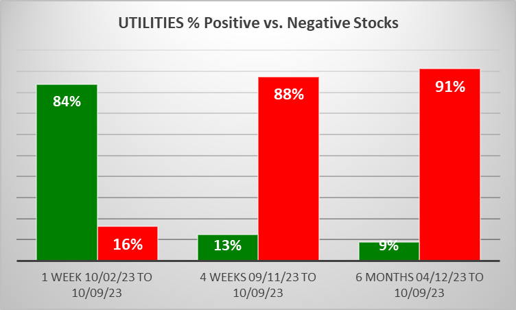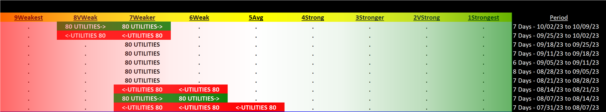 Utilities 2023-10-09: UP +1 to WEAKER strength rating (7th strongest of 9 levels), previous move was DOWN