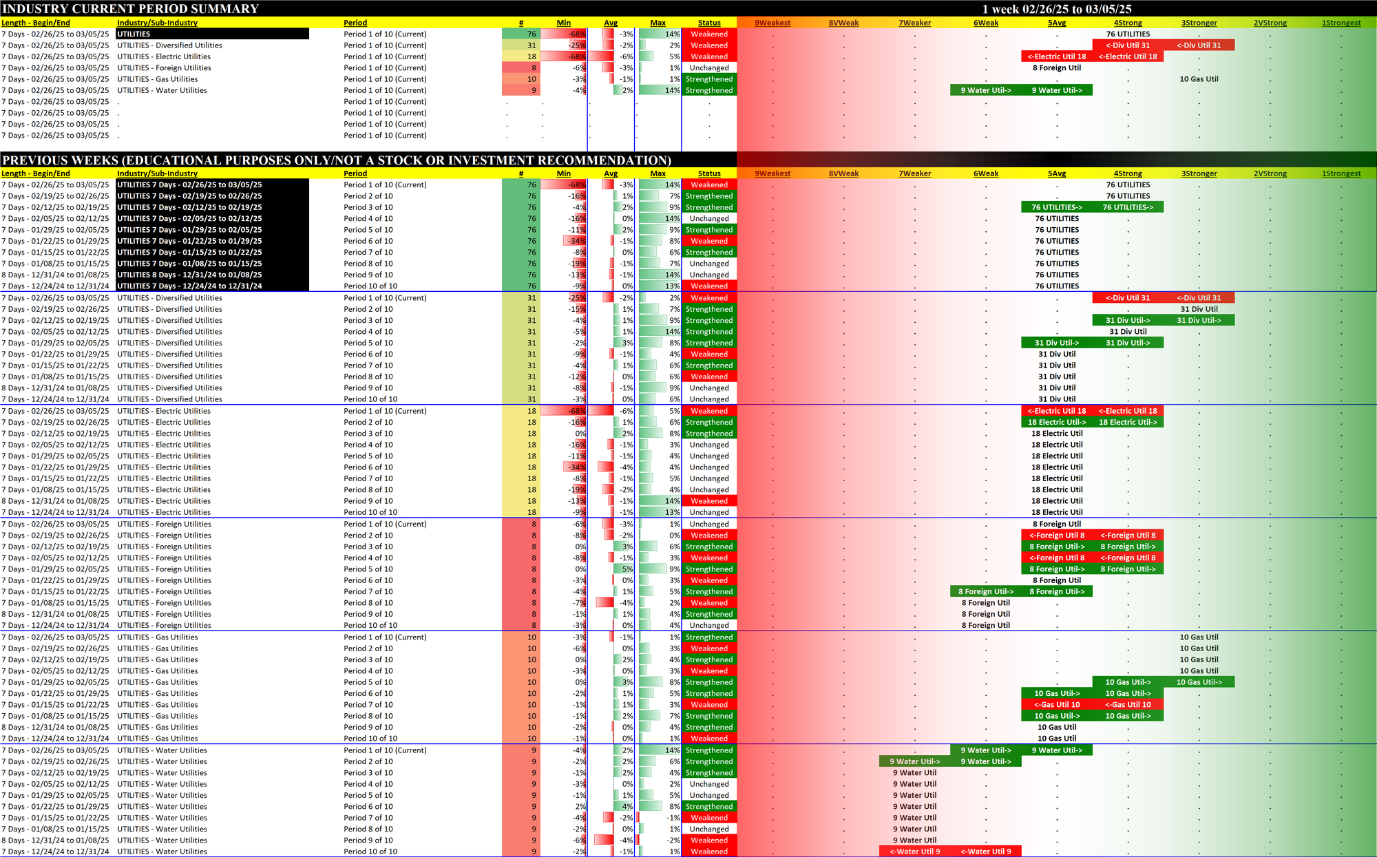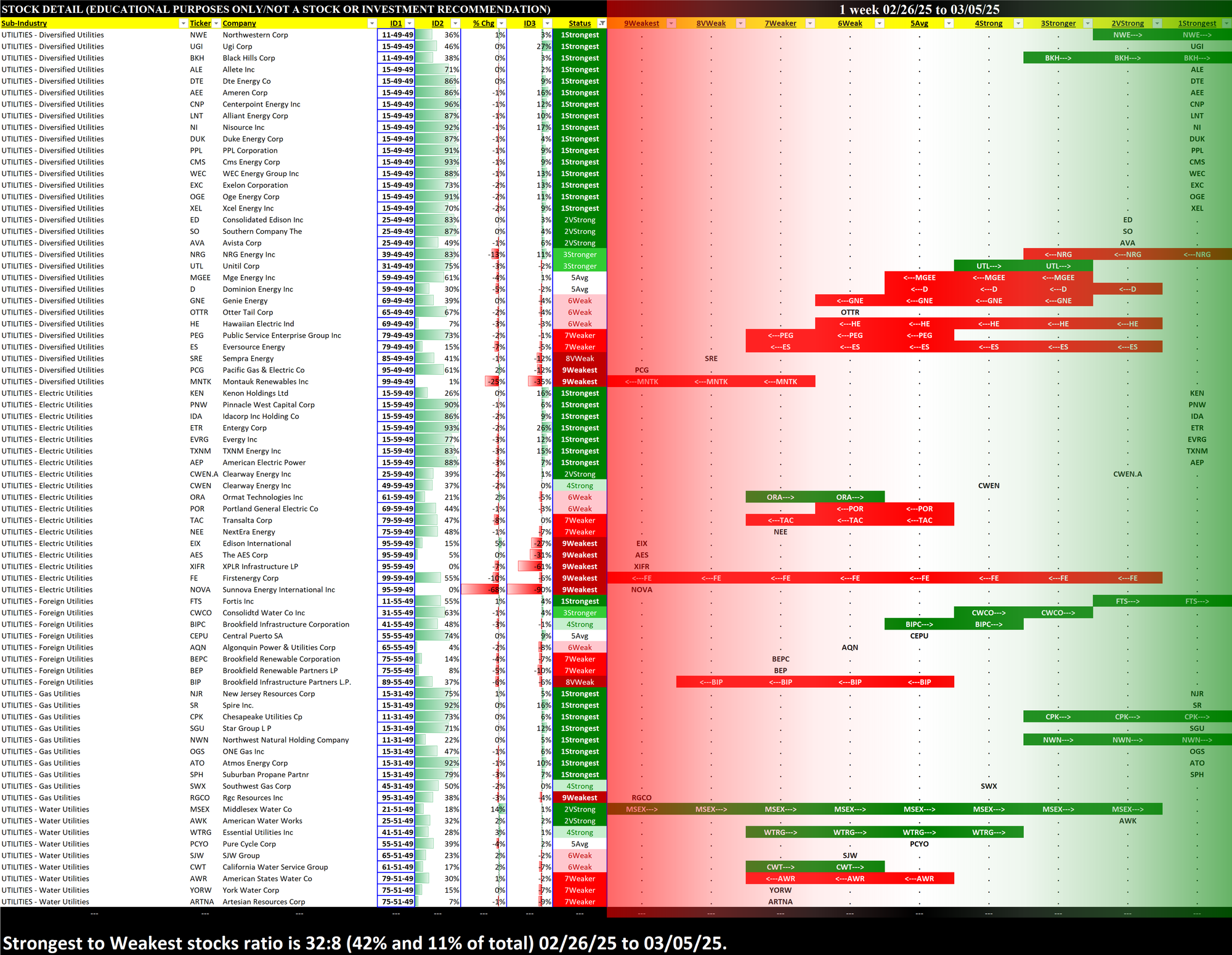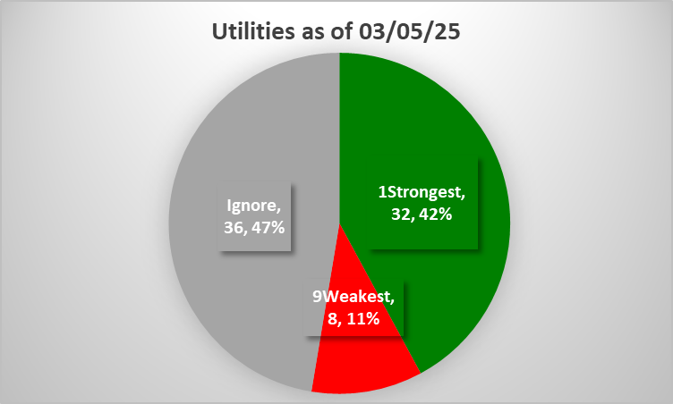 The following provides a listing of all Utilities industry stocks in order of 1) sub-industry, 2) strongest-to-weakest strength rating, then 3) highest to lowest return this week. This is preceded by a summary of the proportion of 1Strongest to 9Weakest stocks.