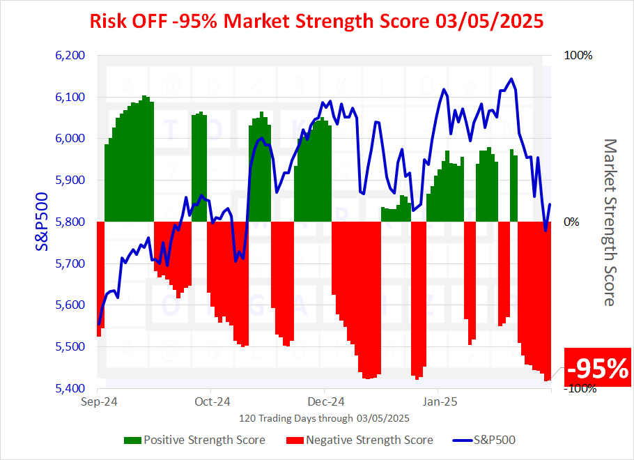 The Market Strength Score changed to negative ("Risk OFF") at -73% as of Friday, February 21, 2025.