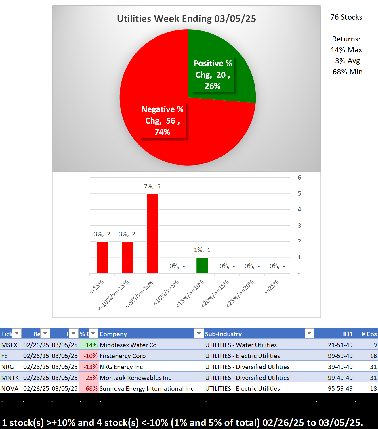The following summarizes this week's positive/negative performance and major outliers (greater than +10% and lesser than -10%) and the past 10 weeks ratings and changes for the Utilities sub-industries.