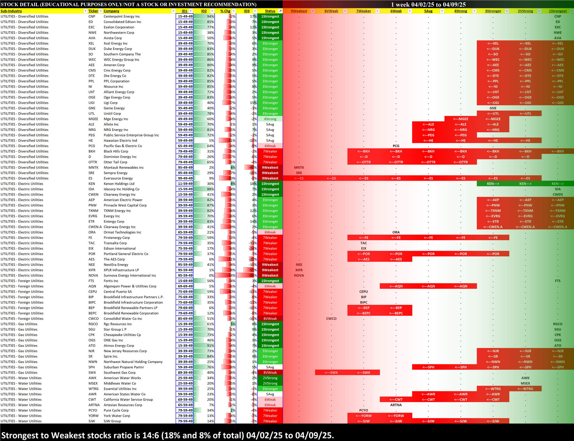 The following provides a listing of all Utilities industry stocks in order of 1) sub-industry, 2) strongest-to-weakest strength rating, then 3) highest to lowest return this week. This is preceded by a summary of the proportion of 1Strongest to 9Weakest stocks.