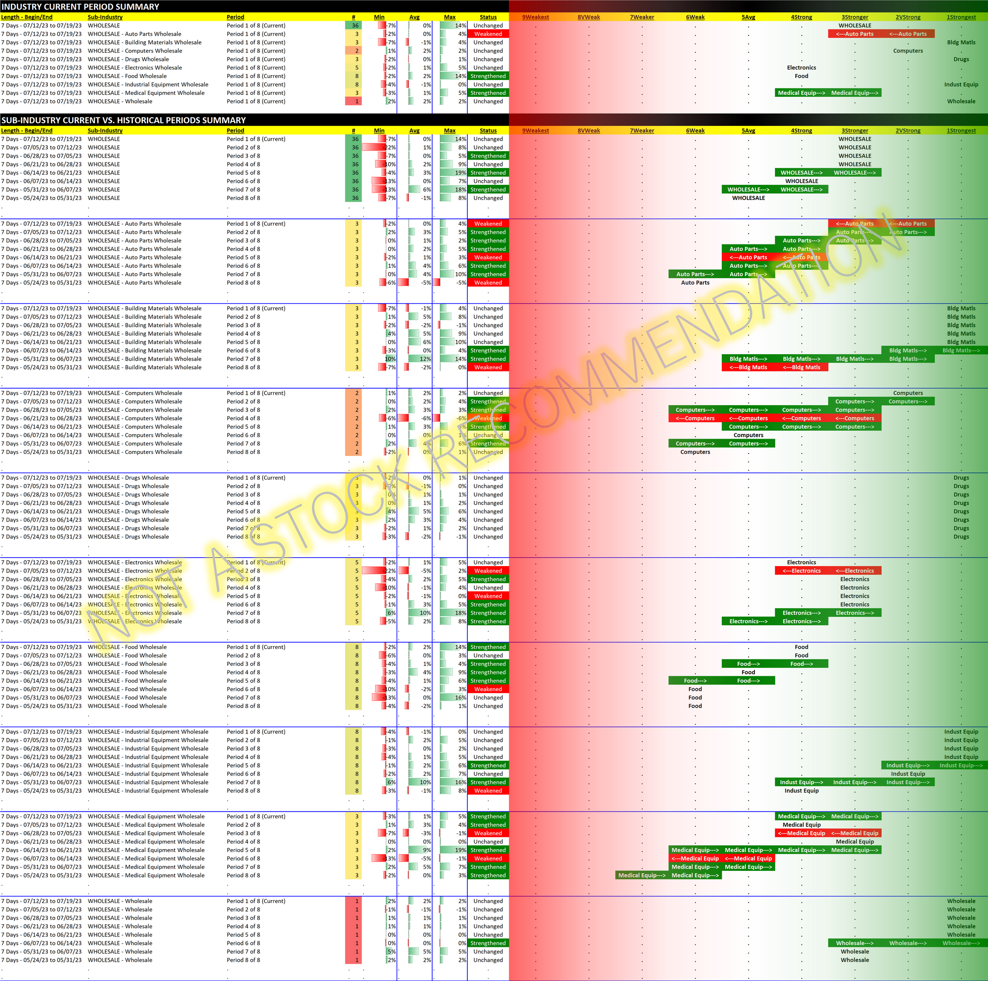 Strengthening but not many underlying companies and no sub-industries of size. Food Wholesale is the largest with eight companies. This has been strengthening which I surmise is not great for the rest of us - this strengthening will end up in retail prices down the road, perhaps. Due to the small number of component stocks this industry will be a low priority for future analysis.